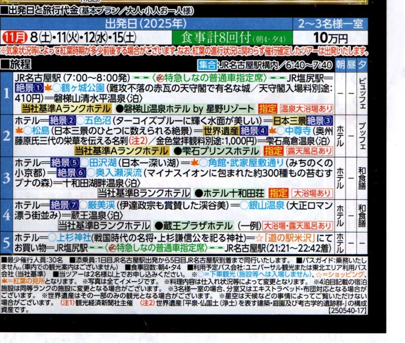 東北旅行の予定(令和7年11月15日(土)〜19日(金))
