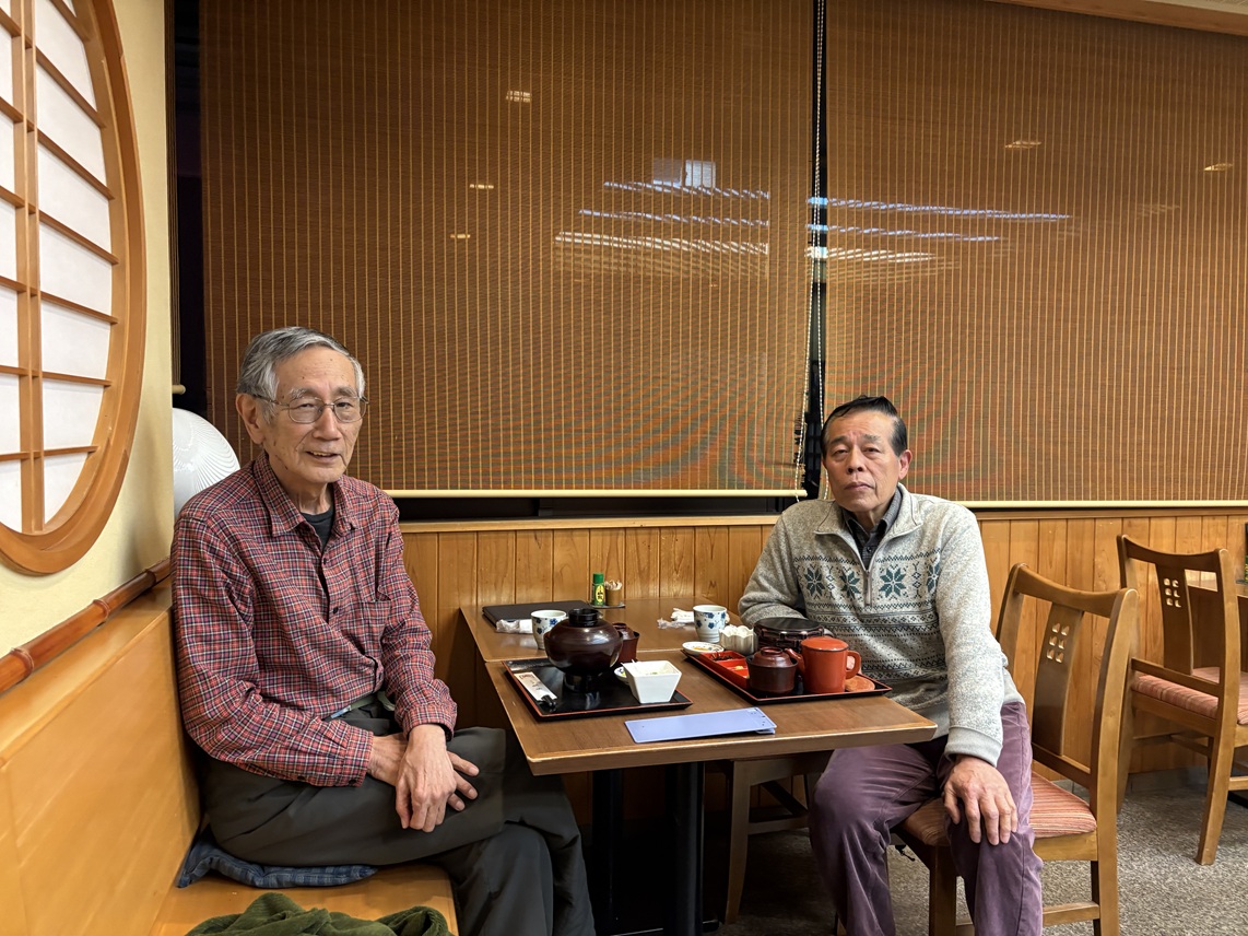 拙句 「友来たる予定を埋めし古暦」 鎌田君の俳句 「寒風に友と仰ぎし大風車 「庭先の山茶花清く古き友」 |